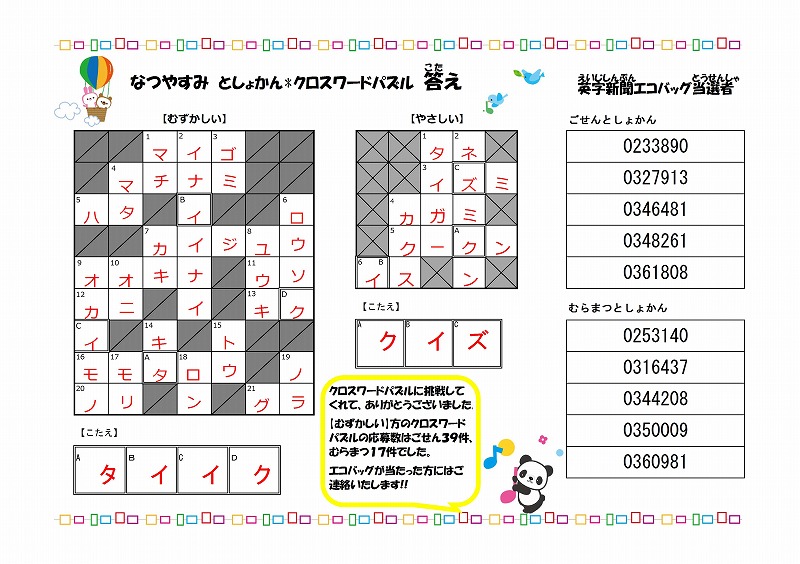 クロスワード【むずかしい】の応募数は、五泉図書館39件・村松図書館17件でした。
